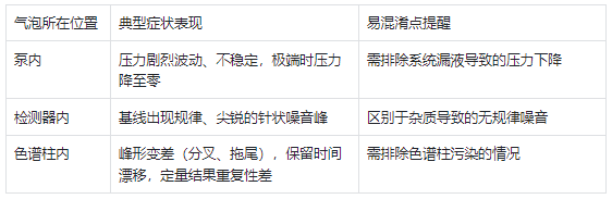 要是發(fā)現(xiàn)壓力波動、基線有噪音,或者保留時間不穩(wěn)定,先別急著處理,得先搞清楚氣泡在哪個位置: