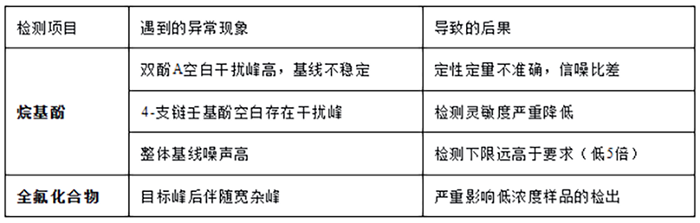 3.關(guān)鍵發(fā)現(xiàn):捕集柱是“元兇”:在排查全氟化合物的雜峰和烷基酚的高基線問題時(shí),通過(guò)對(duì)比試驗(yàn)發(fā)現(xiàn),系統(tǒng)中使用的某知名品牌捕集柱是引入干擾的根源。