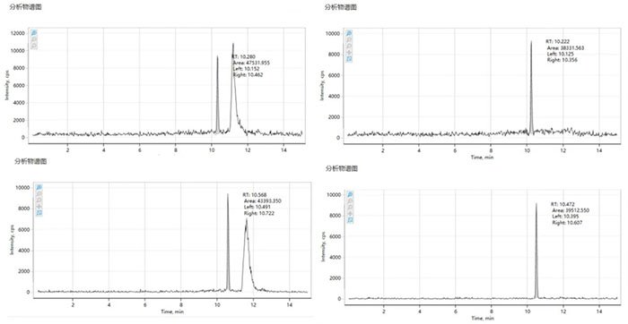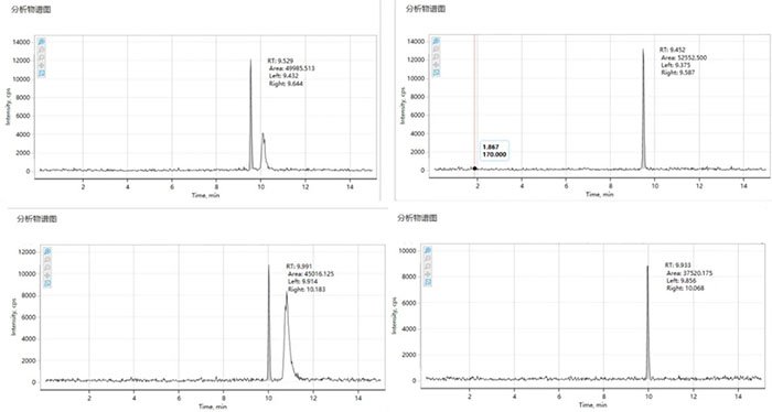 左側(cè):使用某進(jìn)口品牌捕集柱,目標(biāo)峰后明顯伴隨寬峰干擾;