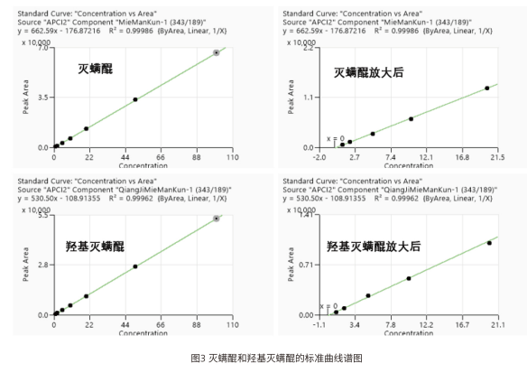 本文采用 EClassical 3200L-MS2 Vertical 9100 三重四極桿液質(zhì)聯(lián)用系統(tǒng),建立了快速、高靈敏度且可靠的 LC-MS/MS 方法,用于測(cè)定食品中滅螨醌和羥基滅螨醌,為該類(lèi)化合物提供了高通量檢測(cè)手段,檢出限完全滿(mǎn)足相關(guān)標(biāo)準(zhǔn)要求。滅螨醌:y=530.50x-108.91355,R2=0.99962;羥基滅螨醌:線(xiàn)性方程及 R2 詳見(jiàn)完整譜圖,R2≥0.999)