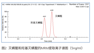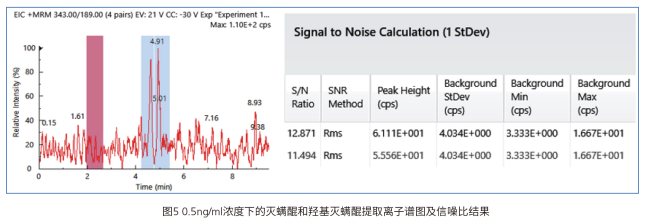 同時(shí)考察了該方法的儀器檢出限情況,在0.5ng/ml的濃度下,羥基滅螨醒和滅螨醒的的信噪比分別為11和12,如下圖所示,可見(jiàn)該方法靈敏度較高,完全滿(mǎn)足該標(biāo)準(zhǔn)的檢出要求。