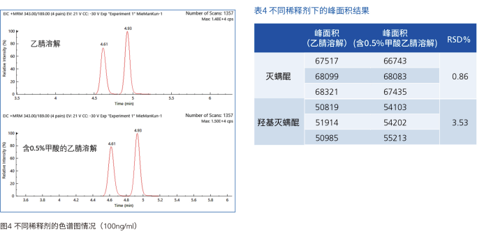 對(duì)比乙腈與含 0.5% 甲酸的乙腈溶液作為稀釋劑時(shí)的標(biāo)準(zhǔn)品響應(yīng)(圖 4、表 4),結(jié)果顯示兩種稀釋劑對(duì)峰面積影響較?。珧?RSD=0.86%,羥基滅螨醌 RSD=3.53%),因此無(wú)需額外添加甲酸,兩種稀釋劑均可使用。