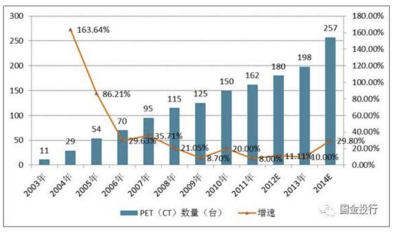 正是 PET-CT 在部分領(lǐng)域的獨(dú)特效用,國內(nèi)裝機(jī)數(shù)量不斷增長。根據(jù)相關(guān)普查情況,自本世紀(jì)初西安萬杰長信醫(yī)院(現(xiàn)已更名 “長安醫(yī)院”)購買了中國大陸第一臺 PET-CT 設(shè)備,中國 PET-CT 的數(shù)量已經(jīng)增長到 2014 年的 257 臺,年均復(fù)合增長率超過 30%。