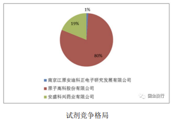 對我們來講,配套試劑 FDG 注射液的制備純化和純度分析需要用到液相色譜,而 FDG 注射液目前主要是國內(nèi)公司占據(jù)主要市場份額,PDB 數(shù)據(jù)庫顯示南京江原、原子高科、安盛科興基本占據(jù)全部市場。其中原子高科的市場占有率高,達(dá)到近 80%,主要?dú)w功于其市場布局較為完善,價格低于安盛科興。