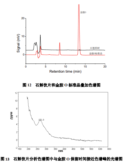 峰,說明該 5 種藥材中不含有金胺 O。石斛分析譜圖與金胺 O 標準品保留時間一致處,有一個色譜峰 (峰高 0.19mV),提取該色譜峰光譜圖 (圖 13),與金胺 O 光譜圖不一致,說明該色譜峰不是金胺 O。