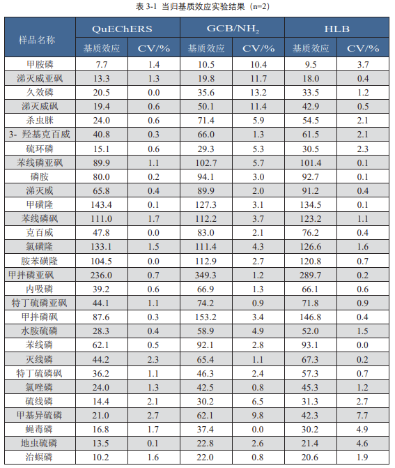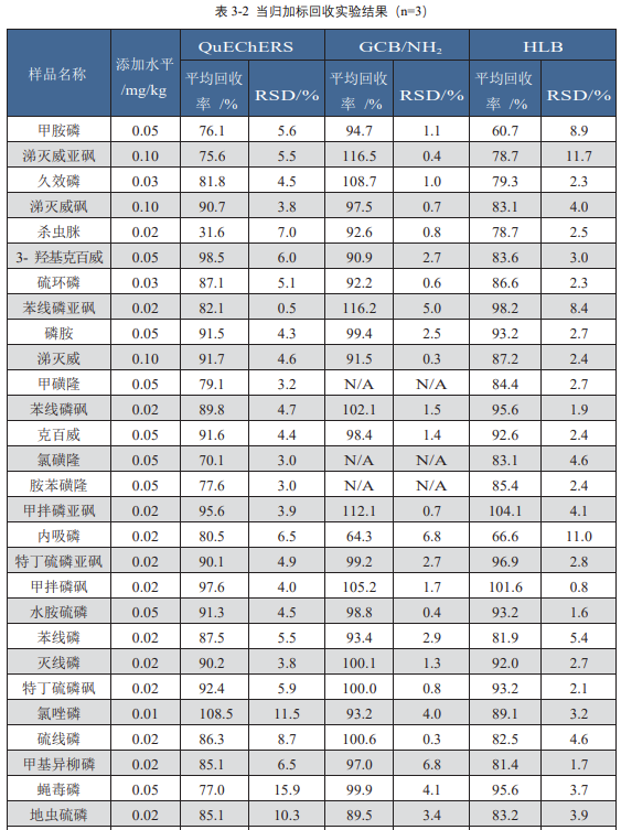 由表 3-2 可知,分別采用 QuEChERS 和固相萃取法處理當(dāng)歸中的 30 種農(nóng)藥殘留,HLB 處理的樣品,所有目標(biāo)物的加標(biāo)回收率均在 60~120% 之間,RSD 小于 20%;其他方法均有數(shù)量不等的目標(biāo)物回收率偏低的情況,不能滿足實(shí)驗(yàn)要求;由圖 1~4 可知,凈化液濃縮后均會(huì)有少量的揮發(fā)油,帶有揮發(fā)油的基質(zhì)容易引起較大的基質(zhì)效應(yīng),對(duì)于此類(lèi)化合物,從表 3-1 基質(zhì)效應(yīng)及表 3-2 回收率綜合分析來(lái)看,HLB 凈化柱的效果佳。