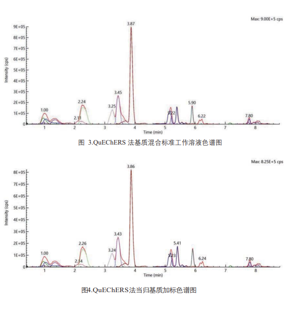 基質(zhì)混合標(biāo)準(zhǔn)工作溶液配制:取高濃度農(nóng)藥混合標(biāo)準(zhǔn)溶液,用空白樣品基質(zhì)溶液稀釋成定量限濃度的基質(zhì)混合標(biāo)準(zhǔn)工作溶液。