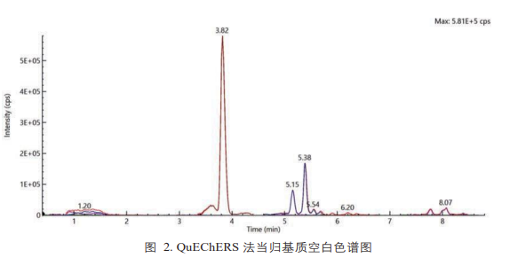 方法二:先用 10mL 乙腈 / 甲苯 = 3/1 (V/V) 活化 GCB/NH?小柱,之后量取直接提取法制備的供試液 2mL 加入到小柱中,待上樣完畢,用 20mL 乙腈 / 甲苯 = 3/1 (V/V) 進(jìn)行洗脫,收集上樣液和洗脫液,40℃旋蒸濃縮至近干,用乙腈轉(zhuǎn)移并稀釋至 2mL,混勻,取上清液 1mL,加入 0.3mL 水,過(guò) 0.22μm 濾膜即得。