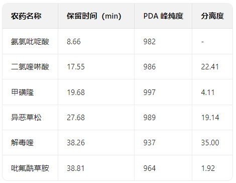 6 種農(nóng)藥實現(xiàn)基線分離,分離度均>1.5,峰純度優(yōu)異,關鍵參數(shù)如下: