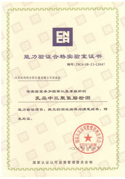 大連依利特分析儀器有限公司作為國內(nèi)知名廠家,秉承著 “質(zhì)量更佳、服務(wù)更優(yōu)、創(chuàng)新更快” 的理念,二十年來為食品安全、藥品檢測及高校應(yīng)用等眾多行業(yè)提供著完善的分析方法及先進(jìn)的儀器配置。從蘇丹紅、孔雀石綠到 “三鹿奶粉三聚氰胺” 事件,關(guān)系著國計(jì)民生的 “食品安全” 問題一次次為我們敲響警鐘,并引起社會廣泛關(guān)注。針對 “三聚氰胺” 事件,依利特人在第一時(shí)間做出反應(yīng),榮獲由國家認(rèn)證認(rèn)可監(jiān)督管理委員會頒發(fā)的 “能力驗(yàn)證合格實(shí)驗(yàn)室證書”,并且按照 GB/T 22388-2008《原料乳與乳制品中三聚氰胺檢測方法》、GB/T 22400-2008《原料乳中三聚氰胺快速檢測 液相色譜法》的國家標(biāo)準(zhǔn),在經(jīng)過大量實(shí)驗(yàn)驗(yàn)證后,提供出符合國標(biāo)的三聚氰胺檢測解決方案,包括分析方法驗(yàn)證及推薦儀器配置在內(nèi)的全套解決方案。