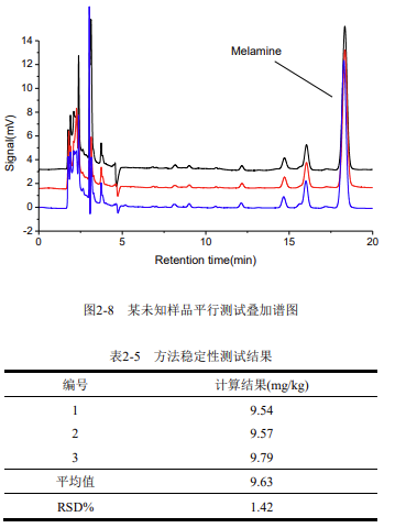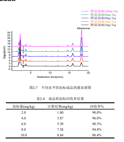 樣品測試過程中,應(yīng)保證其三聚氰胺含量在該線性范圍之內(nèi),若超出該范圍,需將樣品進(jìn)一步稀釋或濃縮。
