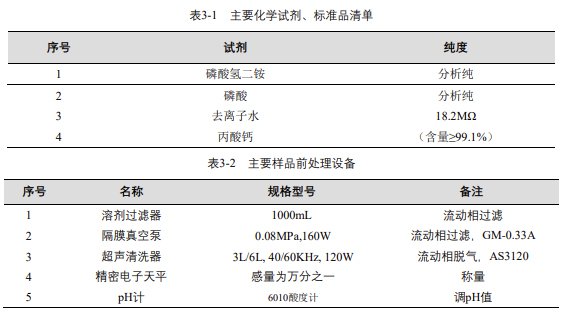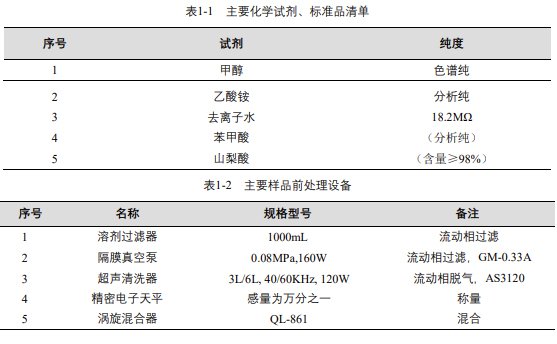 實(shí)驗(yàn)過程中其它玻璃器皿還包括容量瓶 (100mL、50mL、25mL、10mL)、移液槍 (0~1000μL,0~5000μL)、移液槍槍頭 (1mL,5mL)、一次性 PVC 手套、一次性口罩、進(jìn)樣針、濾膜等若干。