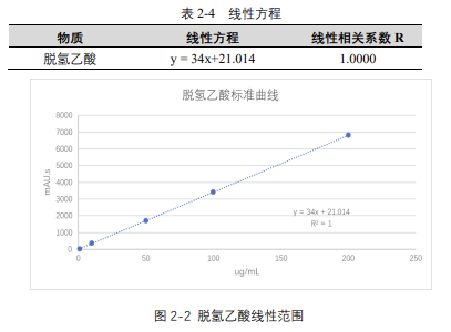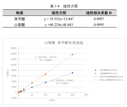 由表 2-4 可知,按照本解決方案提供的儀器及檢測(cè)方法進(jìn)行分析,脫氫乙酸在 5-200μg/mL 的濃度范圍內(nèi),線性良好,相關(guān)系數(shù)達(dá) 1.0000。