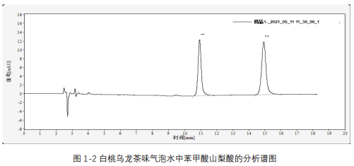 取市售某品牌白桃烏龍茶味氣泡水樣品,按照 1.2 中所述方法進(jìn)行前處理及分析,所得譜圖如圖 1-3 所示: