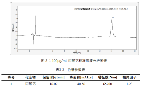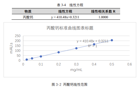 由表 3-4 可知,按照本解決方案提供的儀器及檢測(cè)方法進(jìn)行分析,丙酸鈣在 20-500μg/mL 的濃度范圍內(nèi),線性良好,相關(guān)系數(shù)達(dá) 1.0000。
