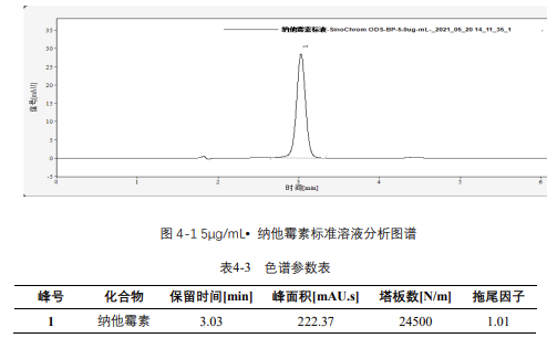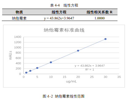 由表 4-4 可知,按照本解決方案提供的儀器及檢測(cè)方法進(jìn)行分析,納他霉素在 1-30μg/mL 的濃度范圍內(nèi),線性良好,相關(guān)系數(shù)達(dá) 1.0000。