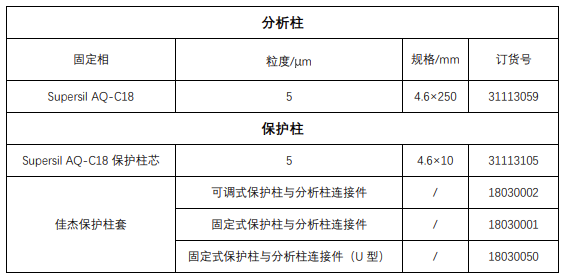 保護(hù)柱填料選擇的原則是好與分析柱填料保持一致,本解決方案中防腐劑的分析檢測(cè)使用的均是 Supersil AQ-C18 色譜柱,因此保護(hù)柱也應(yīng)使用 Supersil AQ-C18 填料。該類型色譜柱及保護(hù)柱的訂貨信息如下: