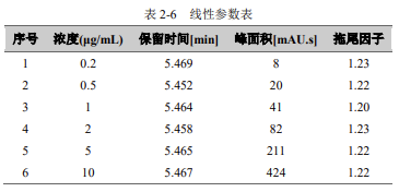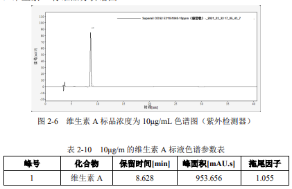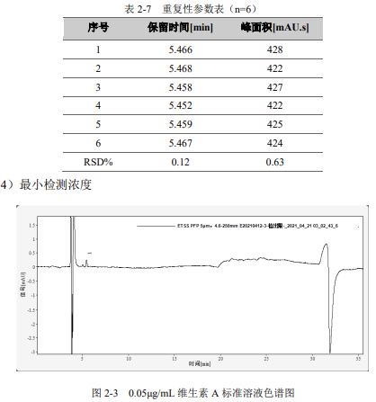重復(fù)性:用濃度為 10μg/mL 維生素 A 標(biāo)準(zhǔn)溶液,連續(xù)進(jìn)樣 6 針,峰面積和保留時間 RSD 結(jié)果如下: