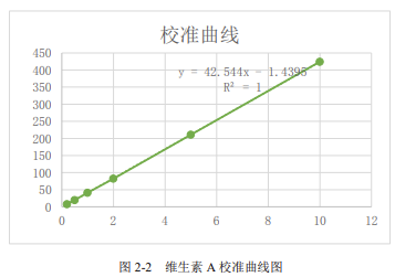 根據(jù)濃度和峰面積數(shù)據(jù),得到維生素 A 的線性曲線方程為:y=42.544x - 1.4395,R^{2}=1.000。因此維生素 A 在 0.2~10μg/mL 濃度范圍內(nèi),線性關(guān)系良好。