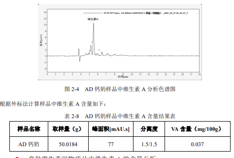 該色譜條件下,儀器的基線噪音為 0.0302mAU,根據(jù)信噪比S/N=3,計算得到維生素 A 的儀器小檢測濃度為 0.017μg/mL,實(shí)際方法檢出限為 3.5μg/100g,比國標(biāo)的方法檢出限 10μg/100g,靈敏度高了不少。實(shí)際樣品分析AD 鈣奶樣品中維生素 A 的含量分析