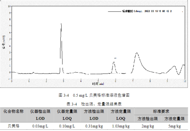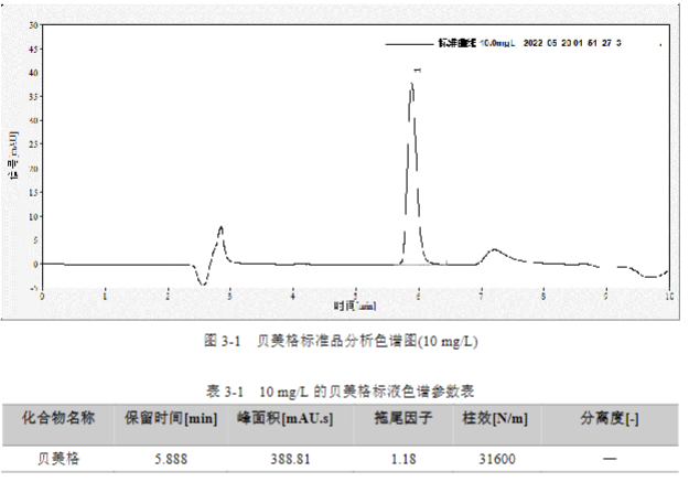 按 GB/T 40898-2021 標(biāo)準(zhǔn)中方法,配制貝美格的標(biāo)準(zhǔn)溶液,質(zhì)量濃度為 0.5 mg/L、1 mg/L、2 mg/L、5 mg/L 和 10 mg/L 的五個(gè)標(biāo)點(diǎn),計(jì)算相關(guān)線性系數(shù)。