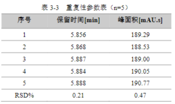 用濃度為 5 mg/L 甲巰咪唑標(biāo)準(zhǔn)溶液,連續(xù)進(jìn)樣 7 針,峰面積和保留時(shí)間 RSD 結(jié)果如下: