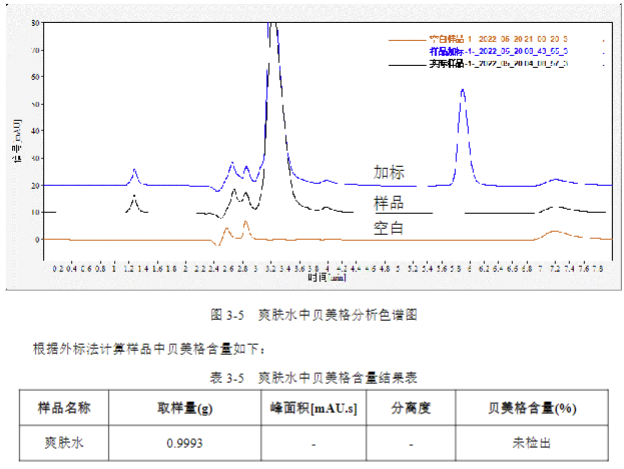 高清資料:圖 3-1 至圖 3-5 高清色譜圖(含基線噪聲放大細(xì)節(jié))、不同基質(zhì)(乳液 / 爽膚水)樣品檢測(cè)譜圖;