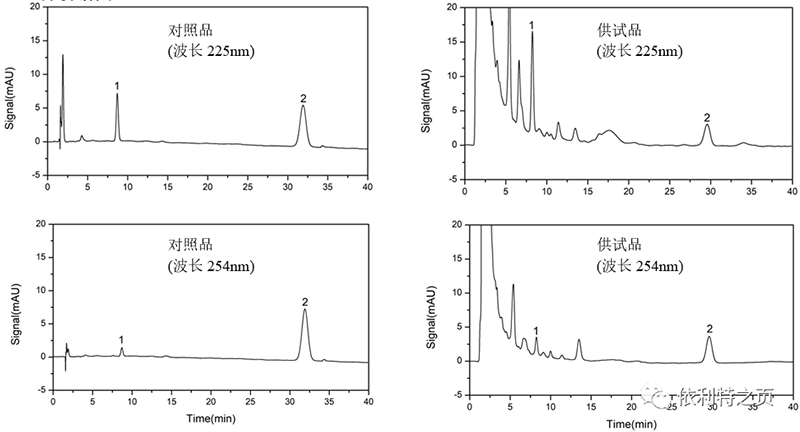 2. 供試品溶液的制備:取重量差異項(xiàng)下的本品,研細(xì),取約0.5g,精密稱定,置具塞錐形瓶中,精密加入甲醇50mL,稱定重量,超聲處理(功率250W,頻率70kHz)40分鐘,再稱定重量,用甲醇補(bǔ)足減失的重量,搖勻,濾過(guò)。精密量取續(xù)濾液10mL(剩余溶液備用),加置中性氧化鋁柱(200~300目,4g,柱內(nèi)徑為1.5cm)上,用甲醇30mL洗脫,收集洗脫液,濃縮至約2mL,用適量甲醇轉(zhuǎn)移至5mL量瓶中,加甲醇稀釋至刻度,搖勻,濾過(guò),取續(xù)濾液,即得。