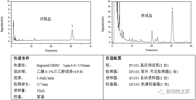 2.供試品溶液的制備:取裝量差異項(xiàng)下的本品,研細(xì),取約2g,精密稱定,精密加入甲醇50mL,稱定重量,超聲處理(功率360W,頻率50kHz)30分鐘,取出,放冷,稱定重量,用甲醇補(bǔ)足減失的重量,搖勻,濾過,精密量取續(xù)濾液25mL,加在中性氧化鋁柱(100~200目,15g,內(nèi)徑為1.5cm)上,用甲醇25mL洗脫,棄去洗脫液,再用80%甲醇100mL洗脫,收集洗脫液,蒸干,殘?jiān)恿鲃酉噙m量,超聲處理(功率360W,頻率50kHz)2分鐘使溶解,轉(zhuǎn)移至10mL量瓶中,加流動相至刻度,搖勻,濾過,取續(xù)濾液,即得。